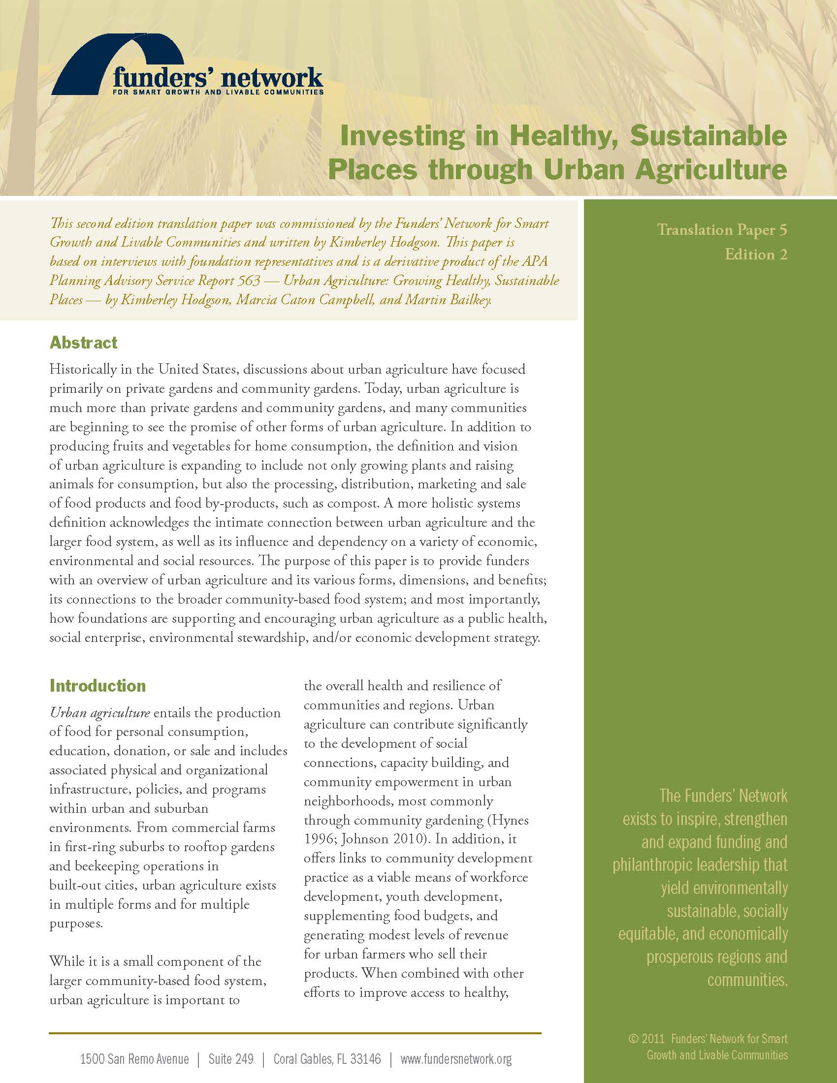 Investing in Urban Agriculture. Authored a report for the Funders’ Network for Smart Growth and Livable Communities, which explores how foundations are supporting and encouraging urban agriculture as a public health, social enterprise, environmental stewardship, and/or economic development strategy.