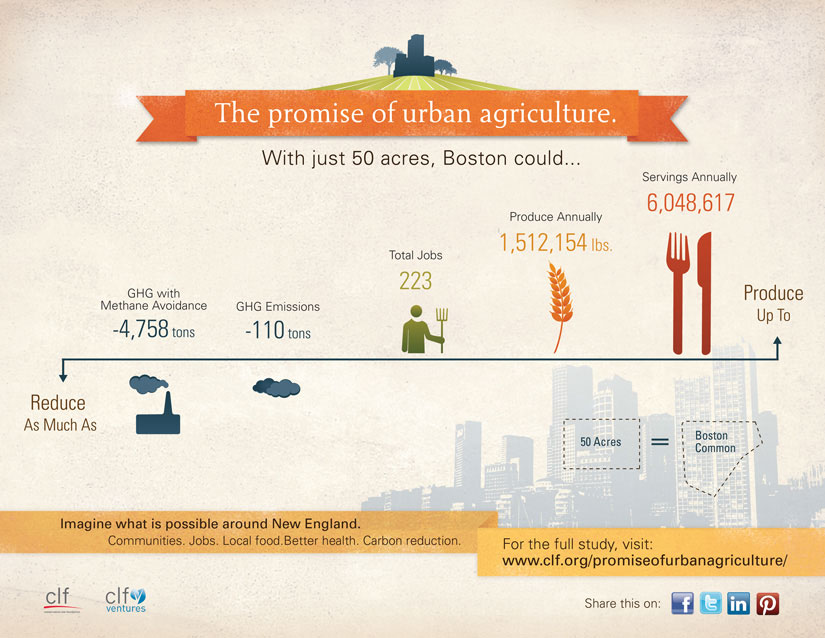 • Significant environmental impacts. Urban agriculture in Boston will result in a net reduction of greenhouse gas (GHG) emissions. 50 acres of properly managed soils would sequester about 114 tons of cabon dioxide (CO2) per year and may result in an additional CO2 reduction of up to 4,700 tons per year.