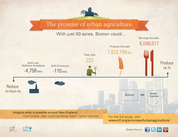 • Urban farms would stimulate the economy by creating jobs. 50 acres of urban agriculture in Boston will likely generate at least 130 direct farming jobs and may generate over 200 jobs depending on actual business characteristics and revenue.